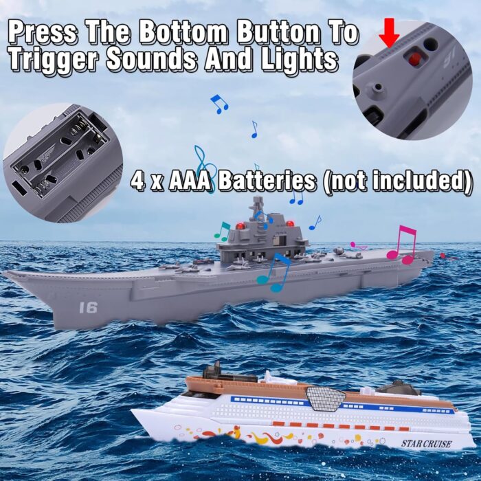 [Immersive Lights and Sounds] Press the buttons located on the base of both the Aircraft Carrier and Cruise Ship to activate an array of enchanting lights and dynamic sounds. The combination of flashing lights and realistic maritime sounds will transport children into a world of maritime exploration. 4 x AAA Batteries (not included)