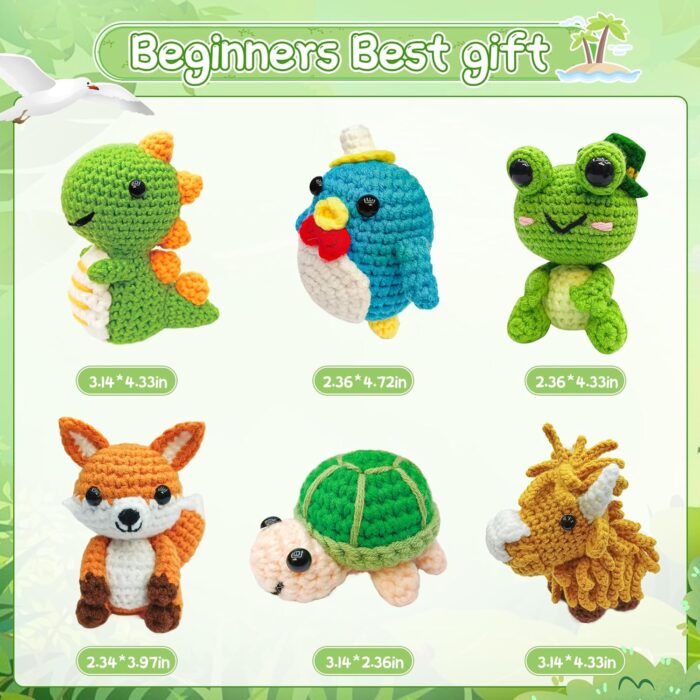 【Complete Kit for Beginners】Crochet kit with all the accessories you need. Comes with yarn, crochet hook, stuffing, needles, eyes, marker clasps, detailed instructions, easy to follow videos.The smooth and soft yarn in this crochet kit is perfect for beginners,unlike traditional yarn,ideal for beginners.You can use it to create six cute animals including a dinosaur, unicorn,elephant, turtle ,giraffe, and rainbow bee.Please pay some patience and concentration.