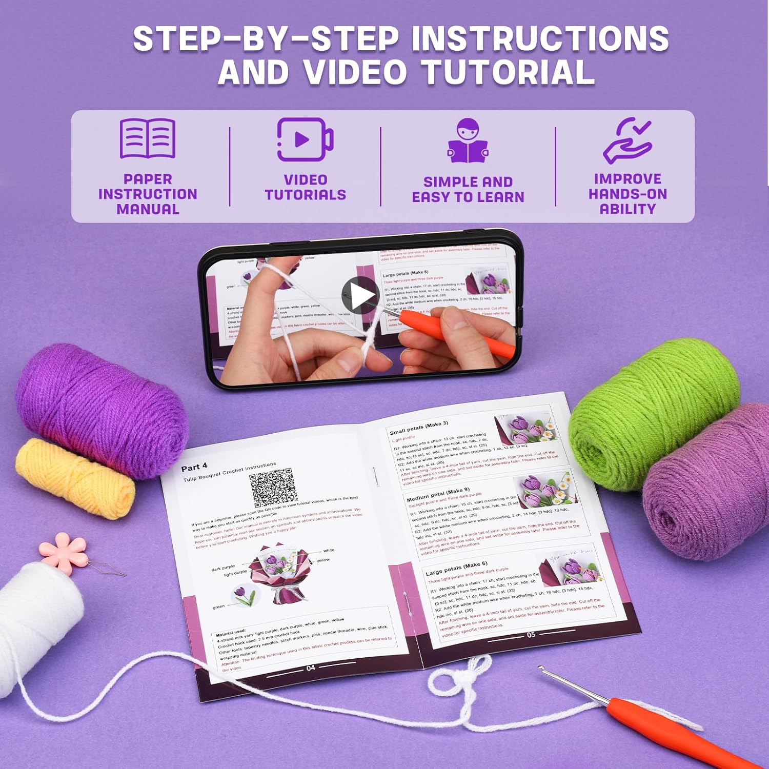 Detailed Instructions and Video: Crochet bouquet kit has basic crochet instructions to help you understand the principles of crochet better.You can easily follow tutorials and video guide to learn how to crochet and create tulips crochet kit,each step has a detailed explanation