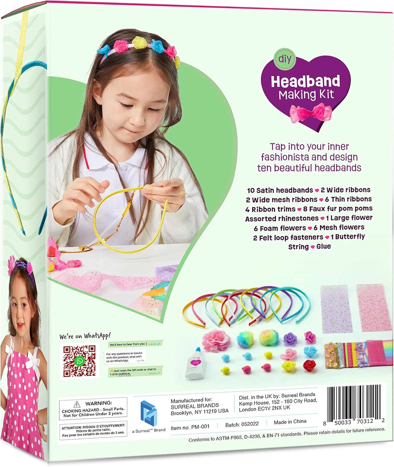 Complete 50+ Piece Craft Kit Includes Everything You Need: 10 satin headbands, 2 wide ribbons, 2 wide mesh ribbons, 6 thin ribbons, 4 ribbon trims (gold leaf, butterfly, gold and silver sequins), 2 large faux fur pom poms, 6 small faux fur pom poms, large flower, 6 foam flowers, 6 mesh flowers, butterfly, assorted rhinestones, 2 felt loop fasteners, string, glue, instruction booklet.